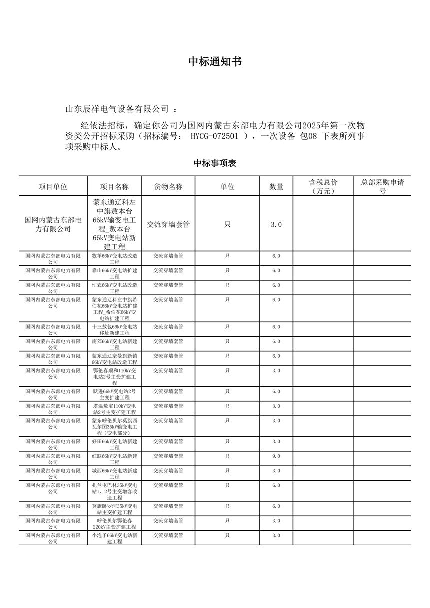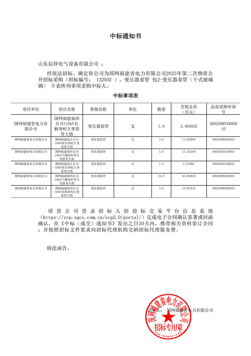 • 2025.02.14 110kV瓷絕緣穿墻套管中標(biāo)通知書